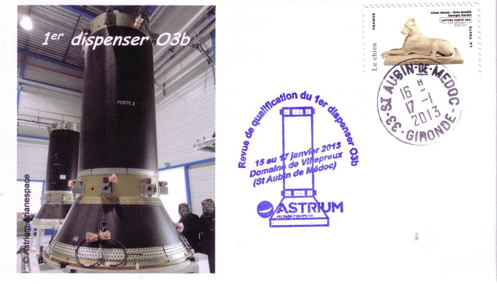 La revue de qualification du 15 au 17 janvier 2013 dans les locaux d’Astrium à St Aubin de Médoc s’est parfaitement déroulée. Ce dispenser 03B est une solution qu’Astriun Space Transportation a développée et fabriquée sur ses sites d’Aquitaine et des Mureaux pour les besoins du client Arianespace. Le développement de ce dispenser a bénéficié de l’expérience acquise sur les programmes précédents, en particulier celle du dispenser Globalstar 2.