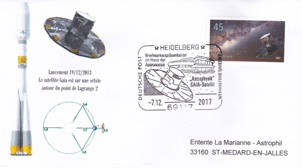 Le 7 décembre 2017, deux timbres allemands ont été mis en vente, représentant les recherches faites en astronomie. Les deux timbres font partie d’une série d’astrophysique de la Deutsche Post. Le timbre Gaia est basé sur une combinaison du satellite Gaia et d’une image de fond de la Voie Lactée. C’est le premier timbre allemand utilisant un revêtement métallique.