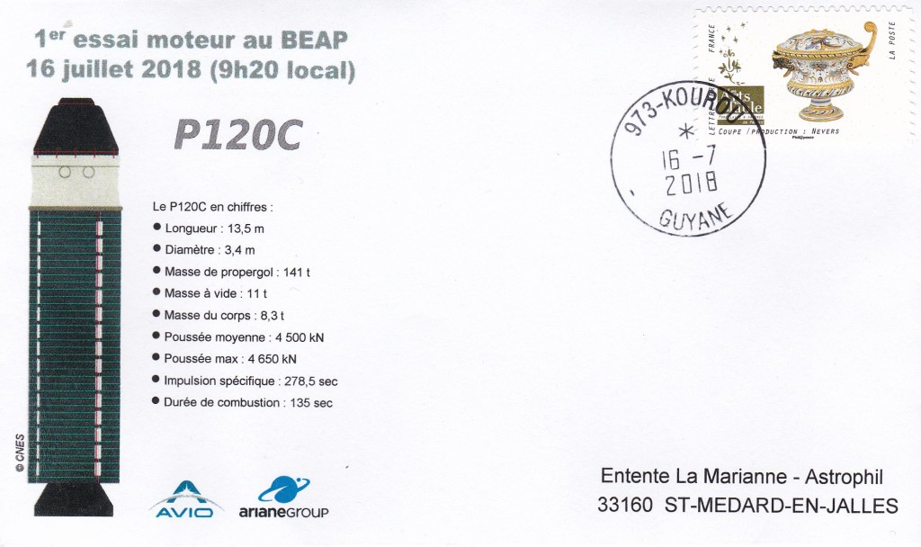 Le premier essai au banc du moteur P120C, commun à Vega-C et Ariane 6, a été réussi le 16 juillet 2018 (09h20 heure locale). Le premier exemplaire du moteur à propergol solide a été mis à feu sur le Banc d’essai des étages à poudre (BEAP) au Centre spatial guyanais de Kourou.