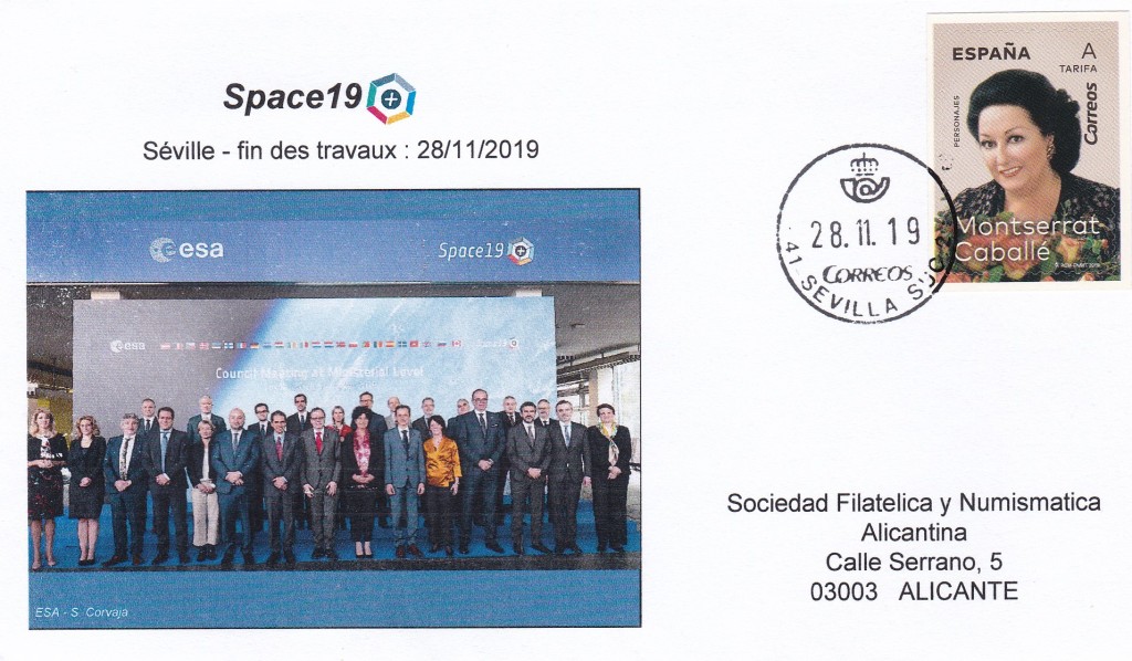 Enveloppe réalisée en 2019 à l’occasion de la fin des travaux de la conférence Space19, le 28 novembre 2019 à Séville (Espagne).