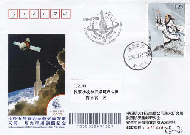 Lancement de la sonde le 23 juillet 2020. Oblitération de la ville de Wenchang dans la province de Hainan, bureau de poste de Longlou.