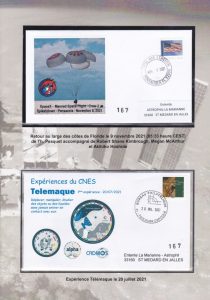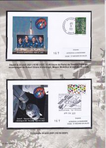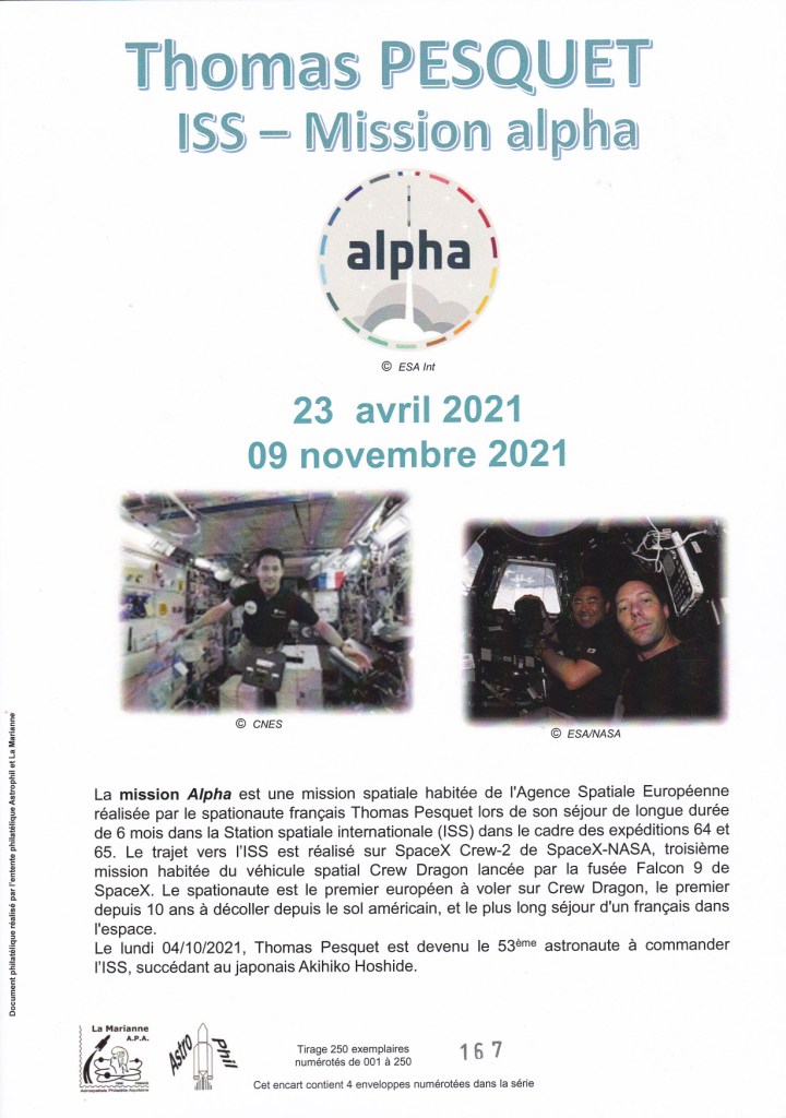 Encart (format A4 cartonné) présentant la mission effectuée par le spationaute Thomas Pesquet dans la Station Spatiale Internationale (ISS) du 02/04/2021 au 09/11/2021, ainsi que les quatre enveloppes réalisées pour cette mission.