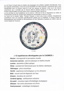 Il a a mené plus d’une centaine d’expériences scientifiques dont une douzaine spécifiquement gérées par le CADMOS. C’est le Centre d’Aide au Développement des Activités en Micropesanteur et des Opérations Spatiales du CNES, situé au Centre Spatial de Toulouse..