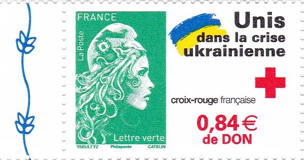 Timbre Lettre Verte Marianne Engagée « Solidarité Ukraine » avec complément à 0,84€. Réf Yvert & Tellier 5594. Cote 4€.