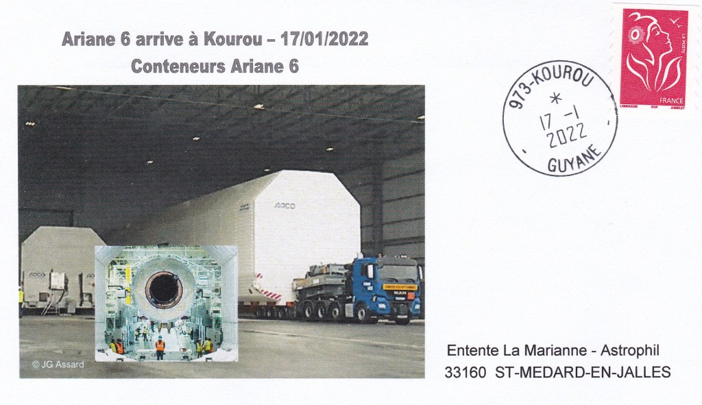 Enveloppe relative à l’arrivée des premiers conteneurs d’éléments Ariane6 à Kourou le 17 janvier 2022.