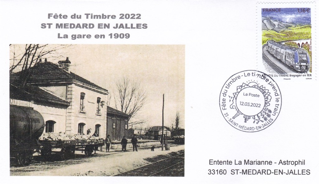 Enveloppe avec le timbre « Voyage en TER ». Enveloppe illustrée de la gare de St Médard en Jalles en 1909.