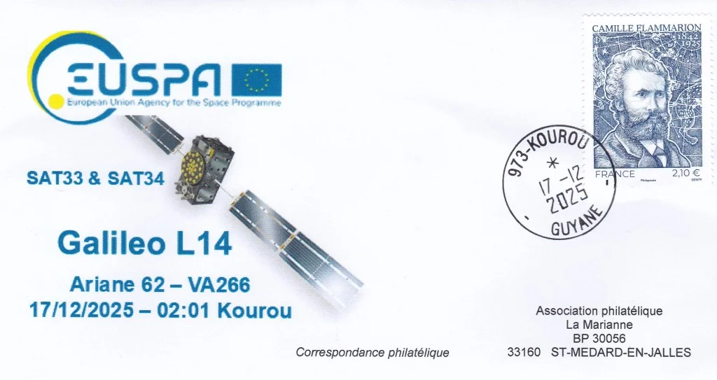 Enveloppe espace réalisée en 2025 à l’occasion du lancement des deux satellites Galileo L14 (Sat 33 et Sat 34) par la fusée européenne Ariane6, le 17 décembre 2025 à Kourou.